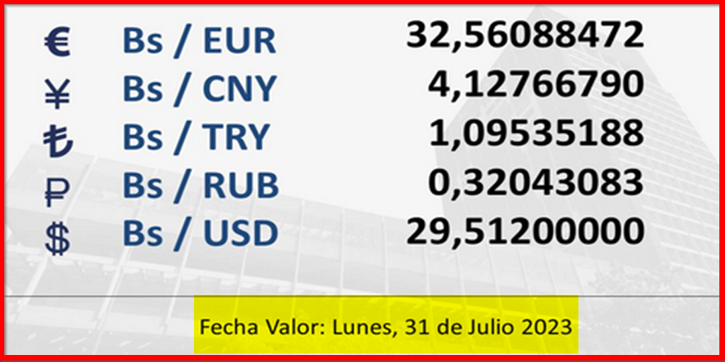 BCV. Cambio oficial para transacciones desde el sábado 29 al LUNES 31 de julio 2023. 28 de julio de 2023 - 4:27 pm Economia, Noticias 1,588 Vistas 2023-07-28 Javier Caceres Compartir Facebook Twitter LinkedIn Pinterest