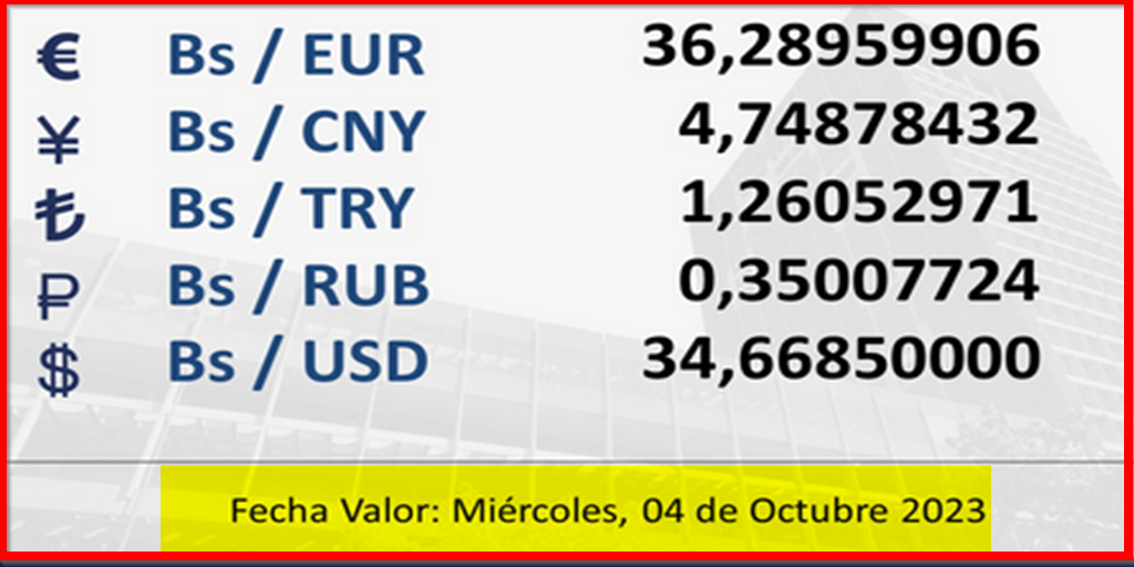 BCV. Cambio referencial para transacciones del día miércoles 4 de octubre de 2023. 03 de octubre de 2023 - 7:23 pm Economia, Noticias 3,623 Vistas 2023-10-03 Javier Caceres Compartir Facebook Twitter LinkedIn Pinterest