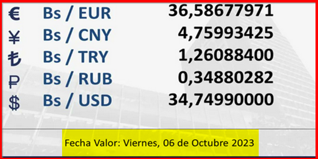 BCV. Cambio referencial para transacciones del día viernes 6 de octubre de 2023. 05 de octubre de 2023 - 6:04 pm Economia, Noticias 3,830 Vistas 2023-10-05 Javier Caceres Compartir Facebook Twitter LinkedIn Pinterest