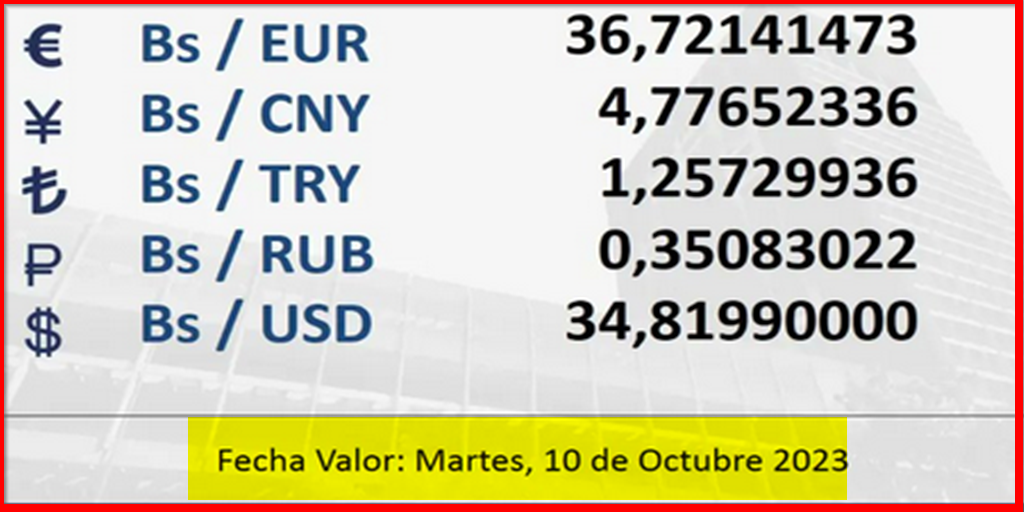 BCV. Cambio referencial para transacciones del día martes 10 de octubre de 2023. 09 de octubre de 2023 - 5:51 pm Economia, Noticias 3,789 Vistas 2023-10-09 Javier Caceres Compartir Facebook Twitter LinkedIn Pinterest