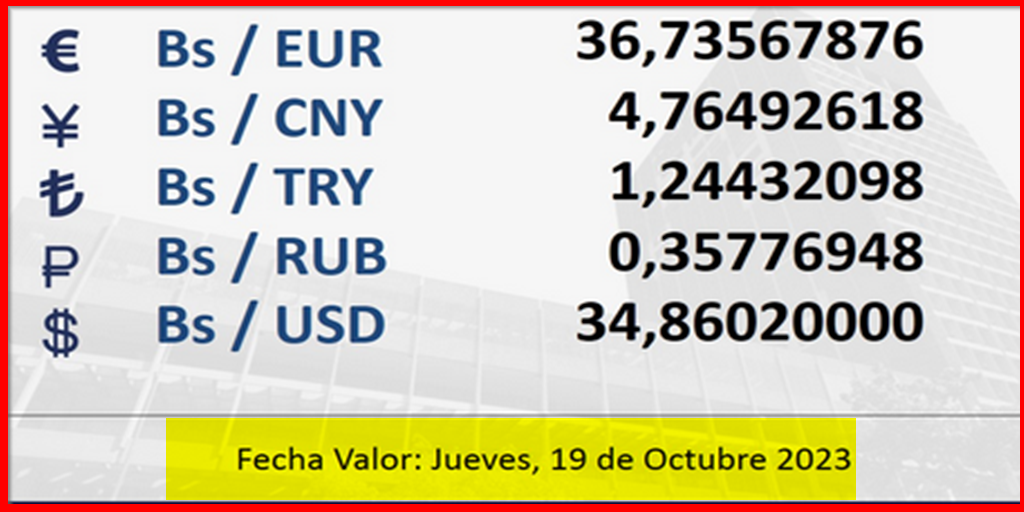 BCV. Cambio referencial para transacciones del día jueves 19 de octubre de 2023. 18 de octubre de 2023 - 10:56 pm Economia, Noticias 4,142 Vistas 2023-10-18 Javier Caceres Compartir Facebook Twitter LinkedIn Pinterest
