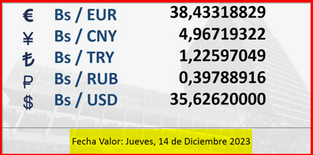 BCV. Tipo de cambio referencial para transacciones del jueves 14 de diciembre de 2023 13 de diciembre de 2023 - 4:16 pm Economia, Noticias 2,036 Vistas 2023-12-13 Javier Caceres Compartir Facebook Twitter LinkedIn Pinterest