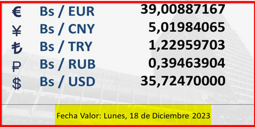 BCV. Tipo de cambio referencial para transacciones desde el sábado 16 al lunes 18 de diciembre de 2023. 15 de diciembre de 2023 - 5:28 pm Economia, Noticias 1,707 Vistas 2023-12-15 Javier Caceres Compartir Facebook Twitter LinkedIn Pinterest