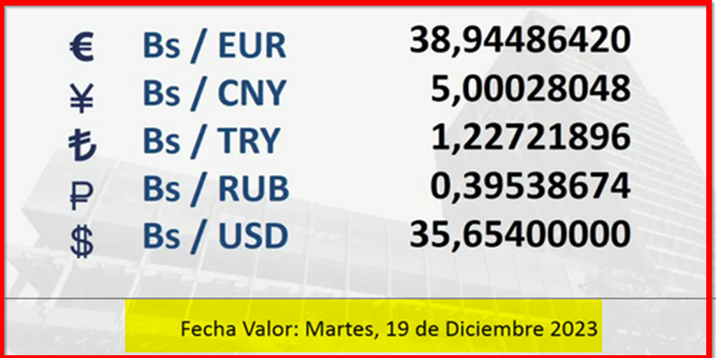 BCV. Tipo de cambio referencial para transacciones del martes 19 de diciembre de 2023 18 de diciembre de 2023 - 5:12 pm Economia, Noticias 2,126 Vistas 2023-12-18 Javier Caceres Compartir Facebook Twitter LinkedIn Pinterest