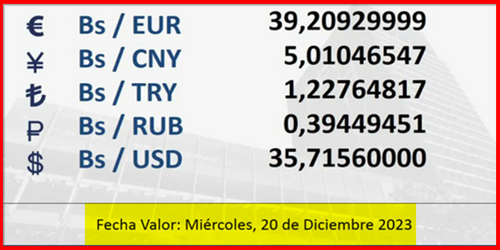 BCV. Tipo de cambio referencial para transacciones del miércoles 20 de diciembre de 2023 19 de diciembre de 2023 - 5:40 pm Economia, Noticias 2,155 Vistas 2023-12-19 Javier Caceres Compartir Facebook Twitter LinkedIn Pinterest