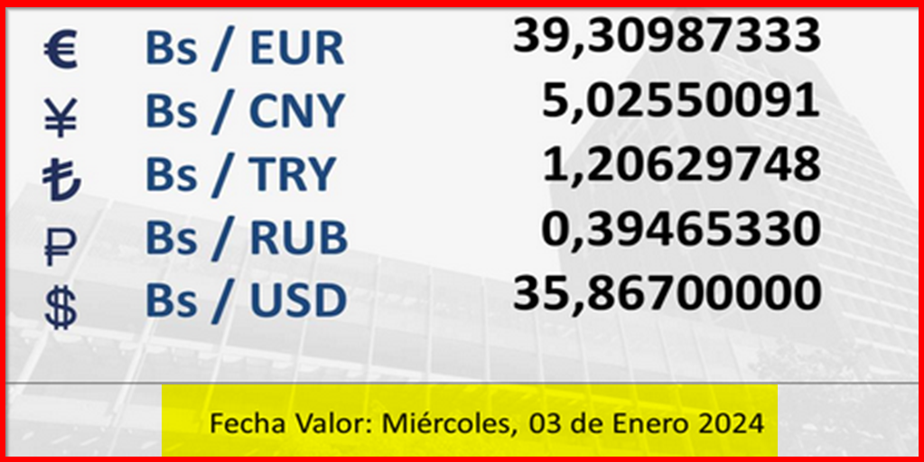 BCV. Tipo de cambio referencial para transacciones del miércoles 3 de enero de 2024. 02 de enero de 2024 - 5:30 pm Economia, Noticias 2,024 Vistas 2024-01-02 Javier Caceres Compartir Facebook Twitter LinkedIn Pinterest
