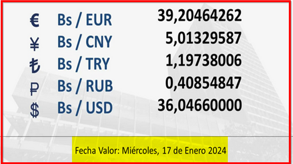 BCV. Tipo de cambio referencial para transacciones del miércoles 17 de enero de 2024 16 de enero de 2024 - 5:42 pm Economia, Noticias 772 Vistas 2024-01-16 Javier Caceres Compartir Facebook Twitter LinkedIn Pinterest