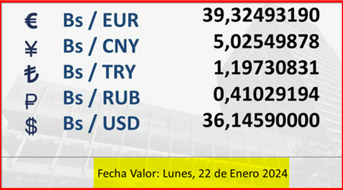 BCV. Tipo de cambio referencial para transacciones desde el sábado 20 hasta el lunes 22 de enero de 2024 20 de enero de 2024 - 8:17 am Economia, Noticias 794 Vistas 2024-01-20 Javier Caceres Compartir Facebook Twitter LinkedIn Pinterest