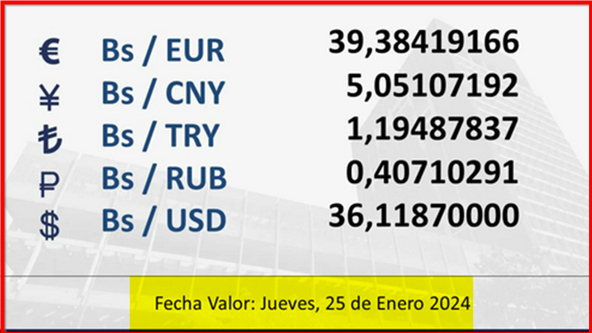 BCV. Tipo de cambio referencial para transacciones del jueves 25 de enero de 2024 24 de enero de 2024 - 5:57 pm Economia, Noticias 918 Vistas 2024-01-24 Javier Caceres Compartir Facebook Twitter LinkedIn Pinterest