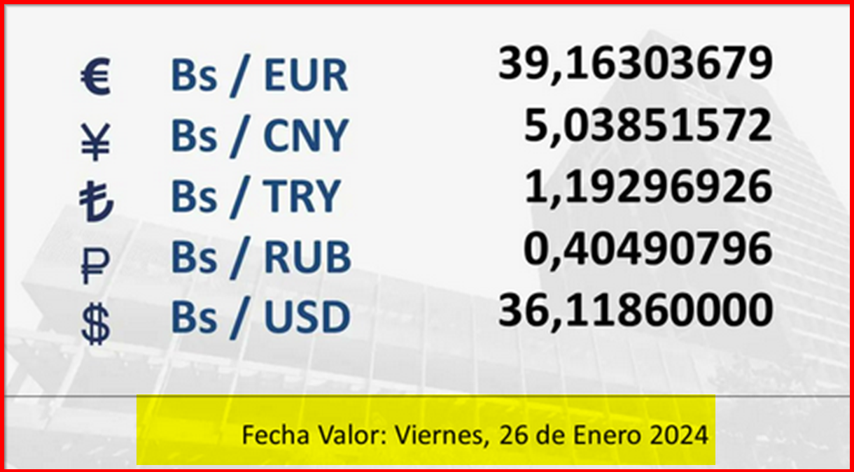 BCV. Tipo de cambio referencial para transacciones del viernes 26 de enero de 2024 25 de enero de 2024 - 5:43 pm Economia, Noticias 999 Vistas 2024-01-25 Javier Caceres Compartir Facebook Twitter LinkedIn Pinterest