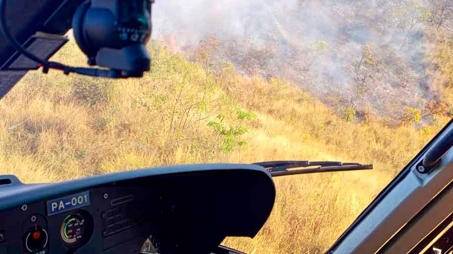 Funcionarios del Servicio de Atención Aérea del estado Aragua compartieron imágenes de un helicóptero sobrevolando las zonas afectadas por el incendio forestal y también fotografías del equipo que trabaja en sofocar las llamas.