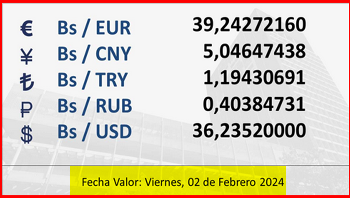 BCV. Tipo de cambio referencial para transacciones del viernes 2 de febrero de 2024 01 de febrero de 2024 - 4:21 pm Economia, Noticias 1,077 Vistas 2024-02-01 Javier Caceres Compartir Facebook Twitter LinkedIn Pinterest