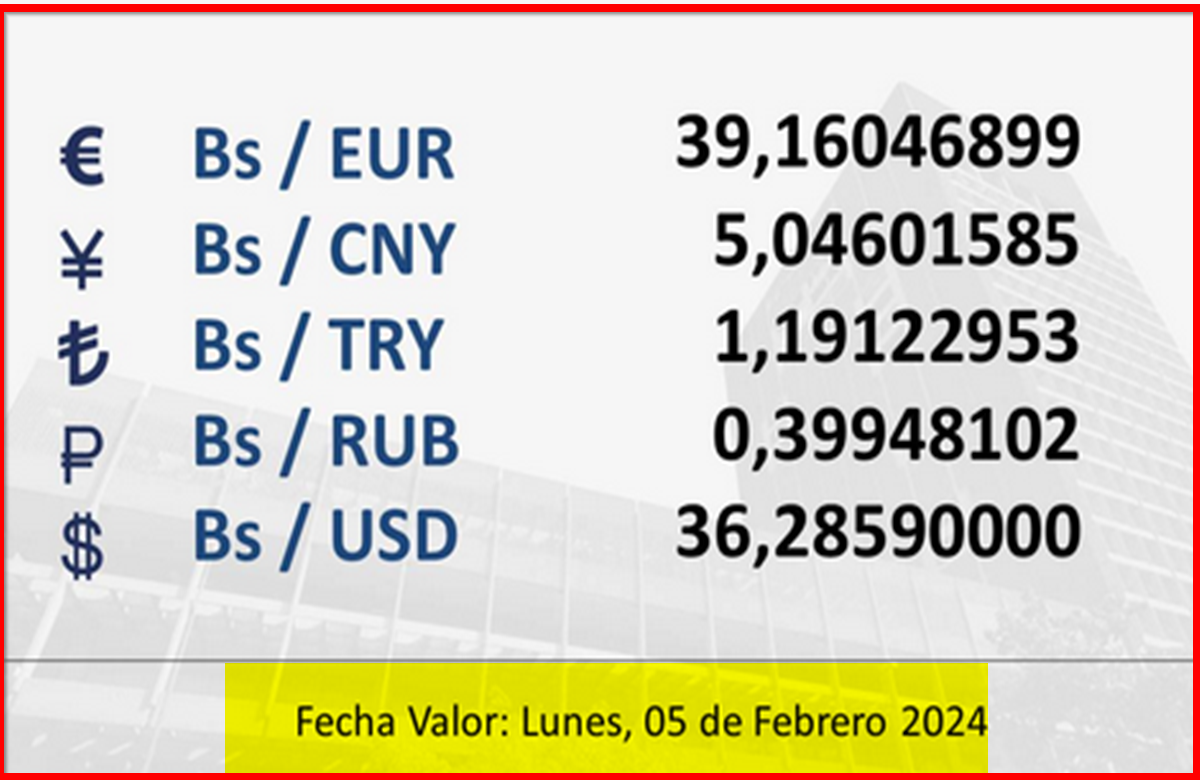 BCV. Tipo de cambio referencial desde el sábado 3 hasta el lunes 5 de febrero de 2024 02 de febrero de 2024 - 6:02 pm Economia, Noticias 1,193 Vistas 2024-02-02 Javier Caceres Compartir Facebook Twitter LinkedIn Pinterest