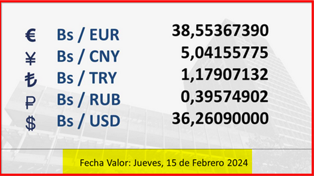 BCV. Tipo de cambio referencial para transacciones del jueves 15 de febrero de 2024 14 de febrero de 2024 - 4:26 pm Economia, Noticias 1,397 Vistas 2024-02-14 Javier Caceres Compartir Facebook Twitter LinkedIn Pinterest