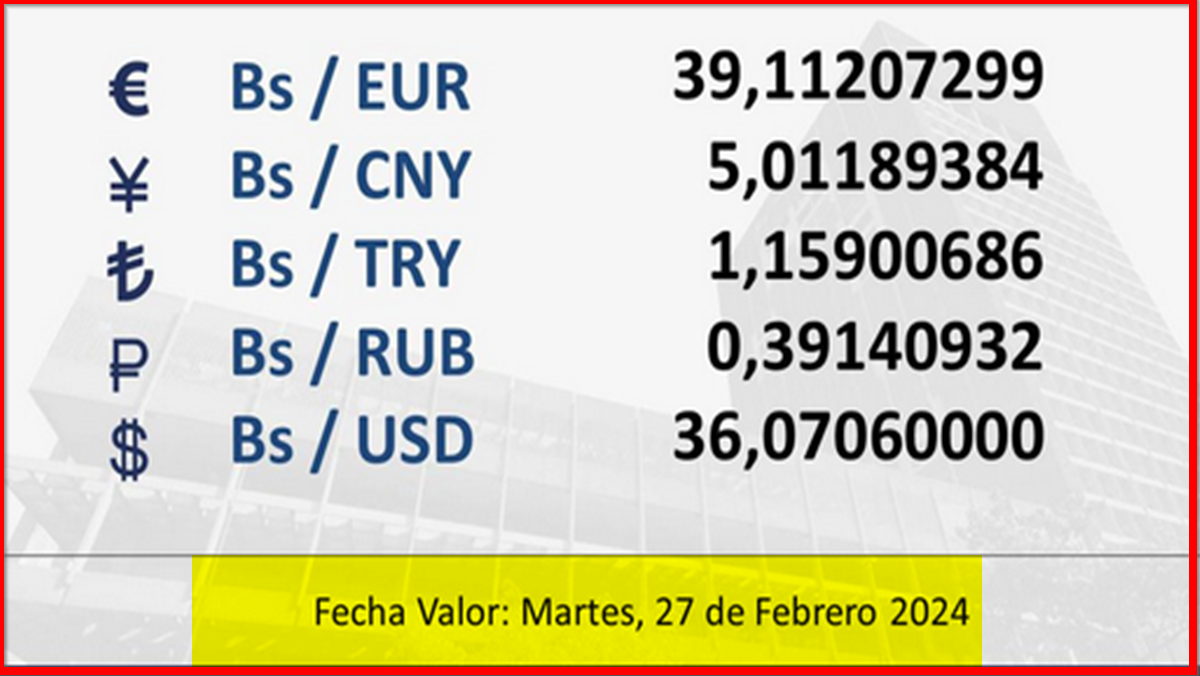BCV. Tipo de cambio referencial para transacciones del martes 27 de febrero de 2024 26 de febrero de 2024 - 4:36 pm Economia, Noticias 1,207 Vistas 2024-02-26 Javier Caceres Compartir Facebook Twitter LinkedIn Pinterest