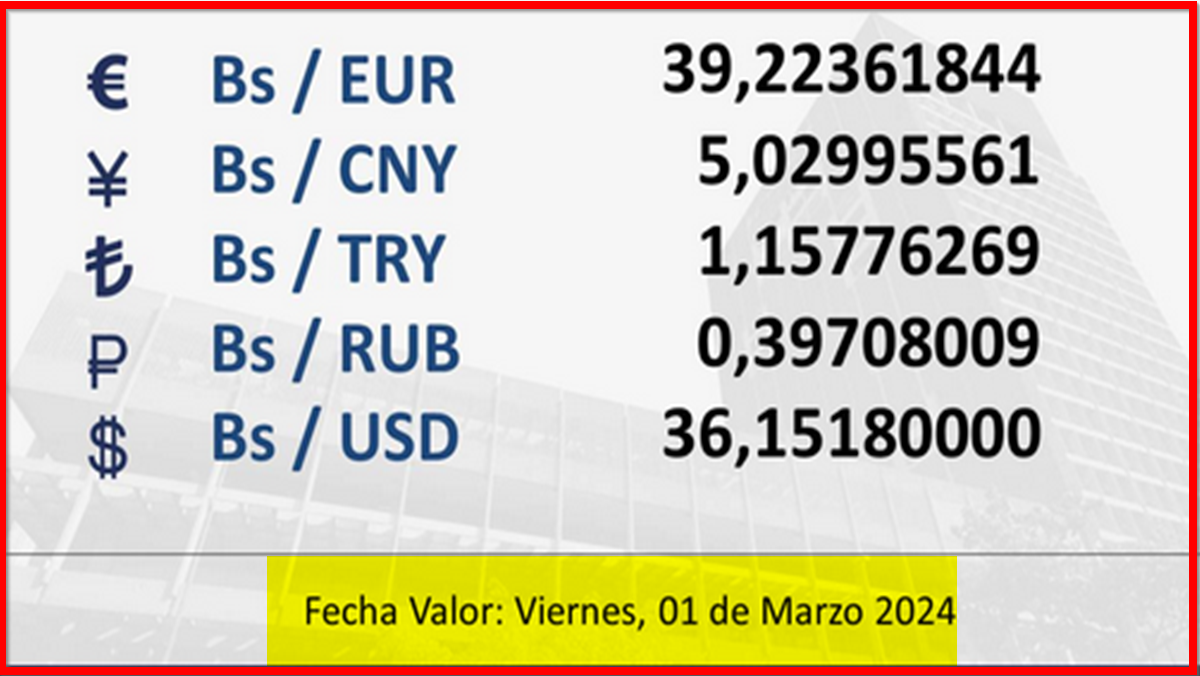 BCV. Tipo de cambio referencial para transacciones del viernes 1ro. de marzo de 2024 29 de febrero de 2024 - 5:24 pm Economia, Noticias 1,628 Vistas 2024-02-29 Javier Caceres Compartir Facebook Twitter LinkedIn Pinterest