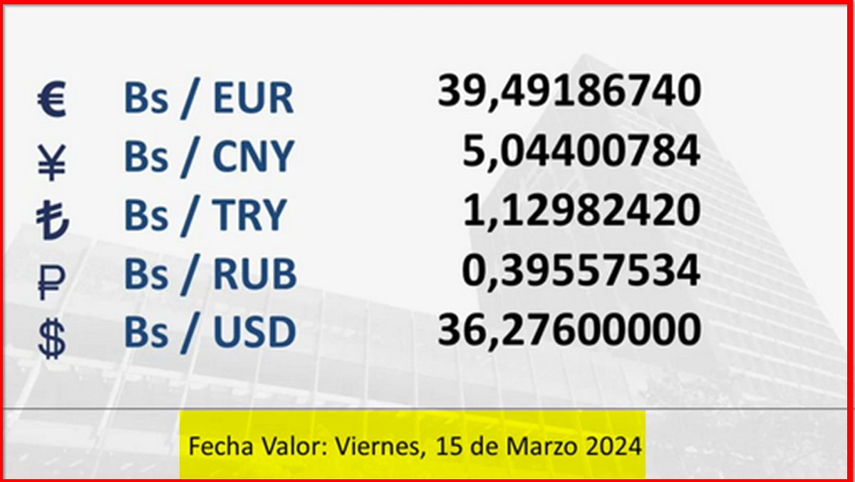 BCV. Tipo de cambio referencial para transacciones del viernes 15 de marzo de 2024 14 de marzo de 2024 - 5:47 pm Economia, Noticias 2,285 Vistas 2024-03-14 Javier Caceres Compartir Facebook Twitter LinkedIn Pinterest