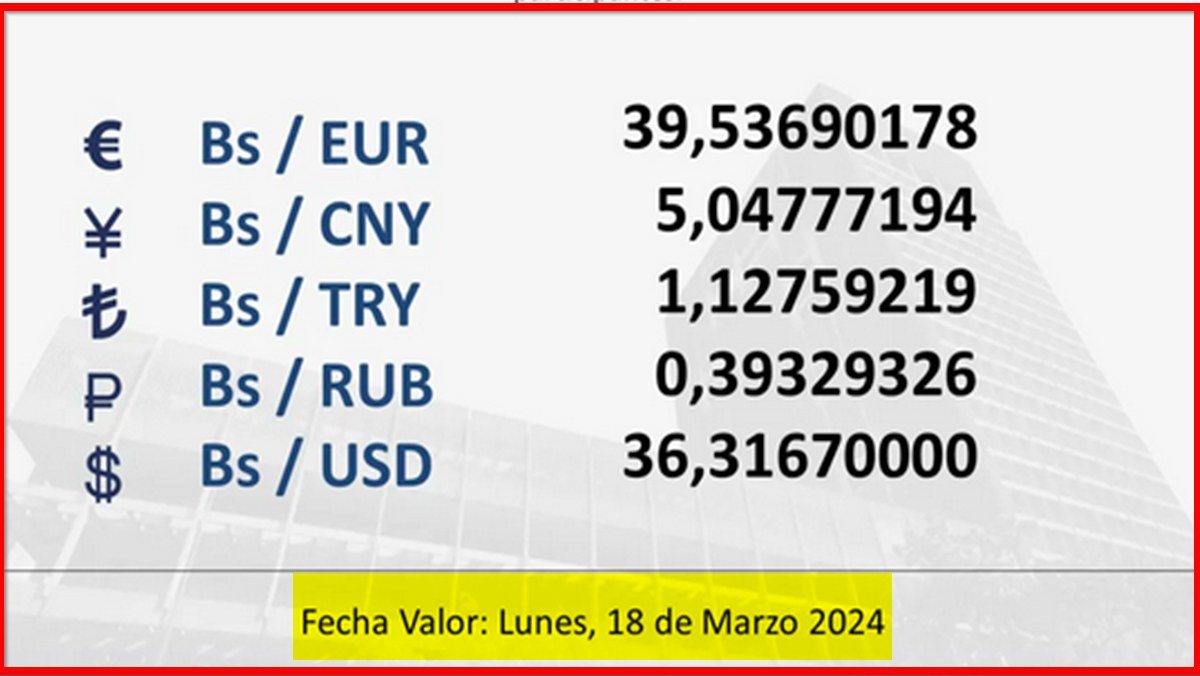 BCV. Tipo de cambio referencial para transacciones desde el sábado 16 hasta el lunes 18 de marzo de 2024 15 de marzo de 2024 - 4:35 pm Economia, Noticias 2,251 Vistas 2024-03-15 Javier Caceres Compartir Facebook Twitter LinkedIn Pinterest