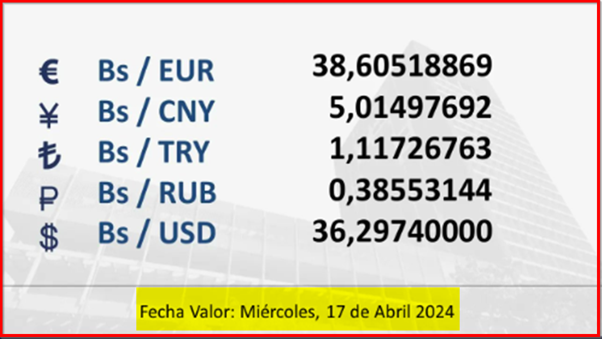BCV. Tipo de cambio referencial para transacciones del miércoles 17 de abril de 2024. 16 de abril de 2024 - 4:23 pm Economia, Noticias 2,912 Vistas 2024-04-16 Javier Caceres Compartir Facebook Twitter LinkedIn Pinterest