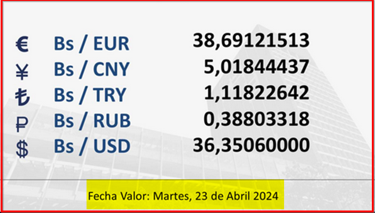 BCV. Tipo de cambio referencial para transacciones del martes 23 de abril de 2024. 22 de abril de 2024 - 5:30 pm Economia, Noticias 3,275 Vistas 2024-04-22 Javier Caceres Compartir Facebook Twitter LinkedIn Pinterest