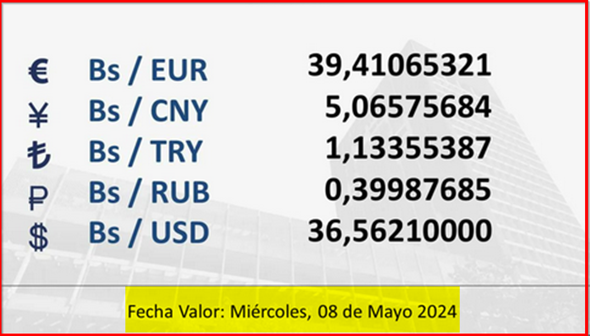 BCV. Tipo de cambio referencial para transacciones del miércoles 8 de mayo de de 2024. 07 de mayo de 2024 - 5:02 pm Economia, Noticias 3,745 Vistas 2024-05-07 Javier Caceres Compartir Facebook Twitter LinkedIn Pinterest