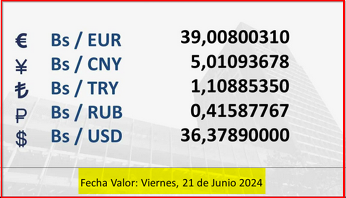 Tipo de cambio referencial para transacciones del viernes 21 de junio de 2024 20 de junio de 2024 - 4:26 pm Economia, Noticias 1,972 Vistas BCV tipo de cambio 2024-06-20 Javier Caceres Compartir Facebook Twitter LinkedIn Pinterest