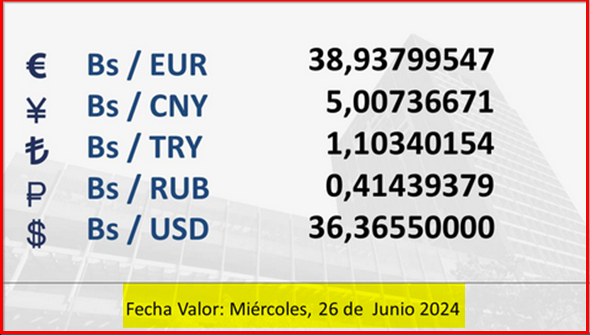 Tipo de cambio referencial para transacciones del miércoles 26 de junio de 2024 25 de junio de 2024 - 5:57 pm Economia, Noticias 2,025 Vistas BCV tipo de cambio 2024-06-25 Javier Caceres Compartir Facebook Twitter LinkedIn Pinterest