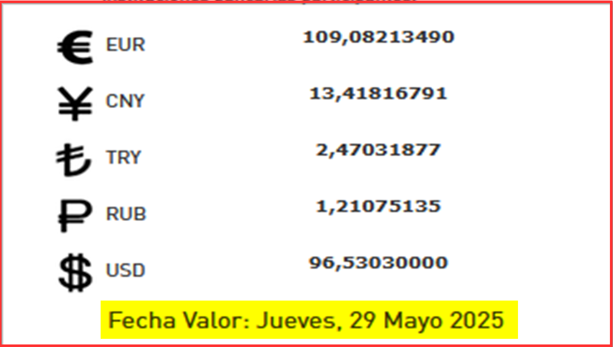 BCV. Cambio oficial referencial para transacciones del jueves 29 de mayo de 2025 28 de mayo de 2025 - 5:26 pm Economia, Noticias 1,985 Vistas 2025-05-28 Javier Caceres Compartir Facebook Twitter LinkedIn Pinterest
