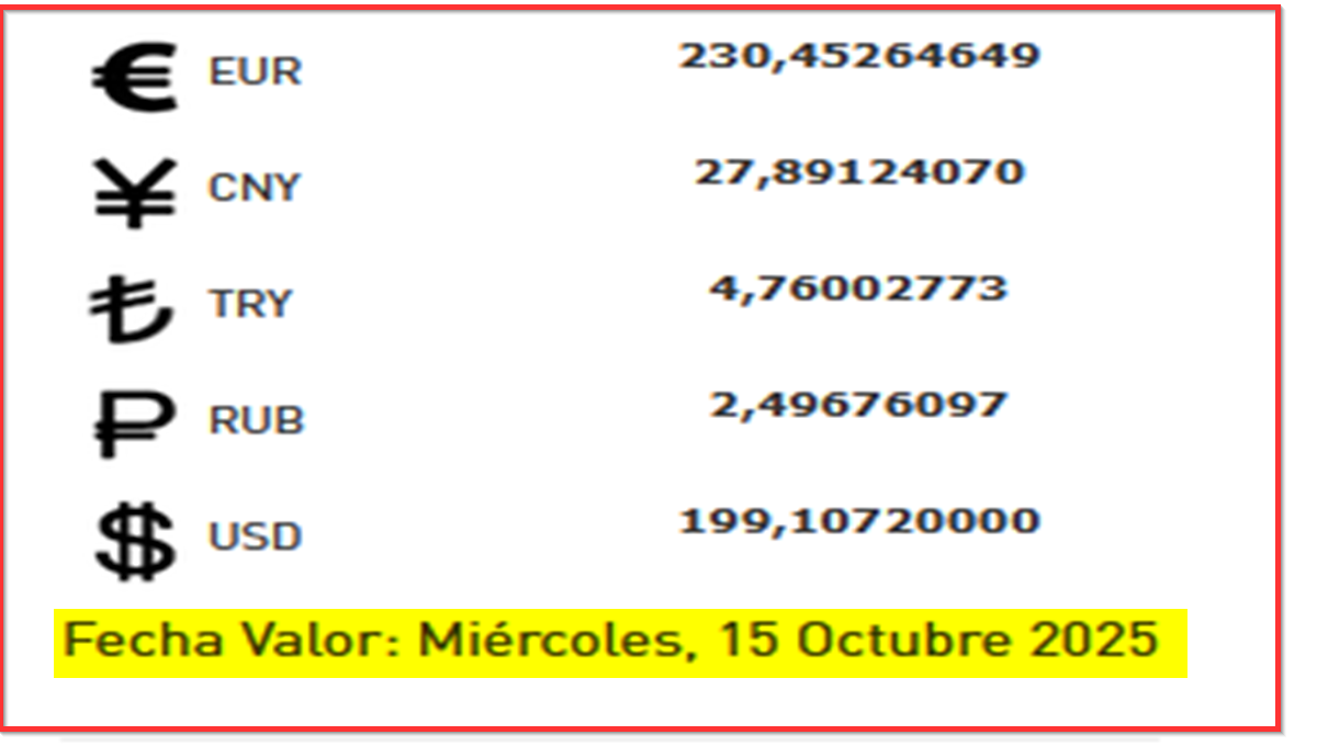BCV. Cambio oficial para transacciones del miércoles 15 de octubre de 2025 14 de octubre de 2025 - 4:49 pm Economia, Noticias 4,407 Vistas 2025-10-14 Javier Caceres Compartir Facebook Twitter LinkedIn Pinterest