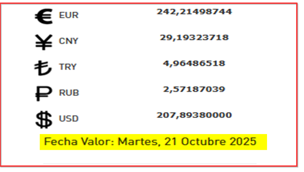 BCV. Cambio oficial para transacciones del martes 21 de octubre de 2025 20 de octubre de 2025 - 8:06 pm Economia, Noticias 4,289 Vistas 2025-10-20 Javier Caceres Compartir Facebook Twitter LinkedIn Pinterest