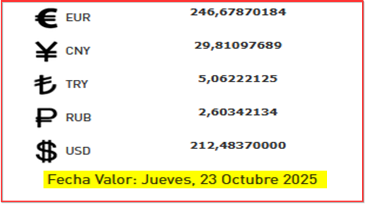 BCV. Cambio oficial para transacciones del jueves 23 de octubre de 2025 22 de octubre de 2025 - 7:45 pm Noticias 597 Vistas 2025-10-22 Javier Caceres Compartir Facebook Twitter LinkedIn Pinterest