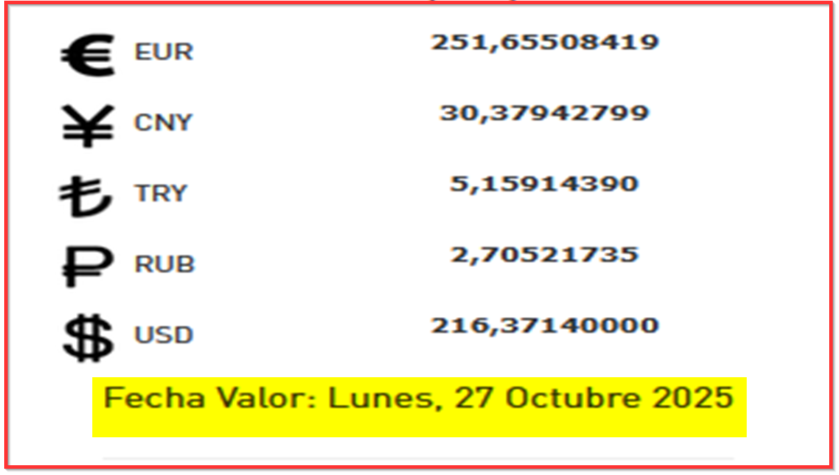 BCV. Cambio oficial referencial para transacciones desde el sábado 25 al lunes 27 de octubre de 2025 24 de octubre de 2025 - 5:46 pm Economia, Noticias 4,848 Vistas 2025-10-24 Javier Caceres Compartir Facebook Twitter LinkedIn Pinterest