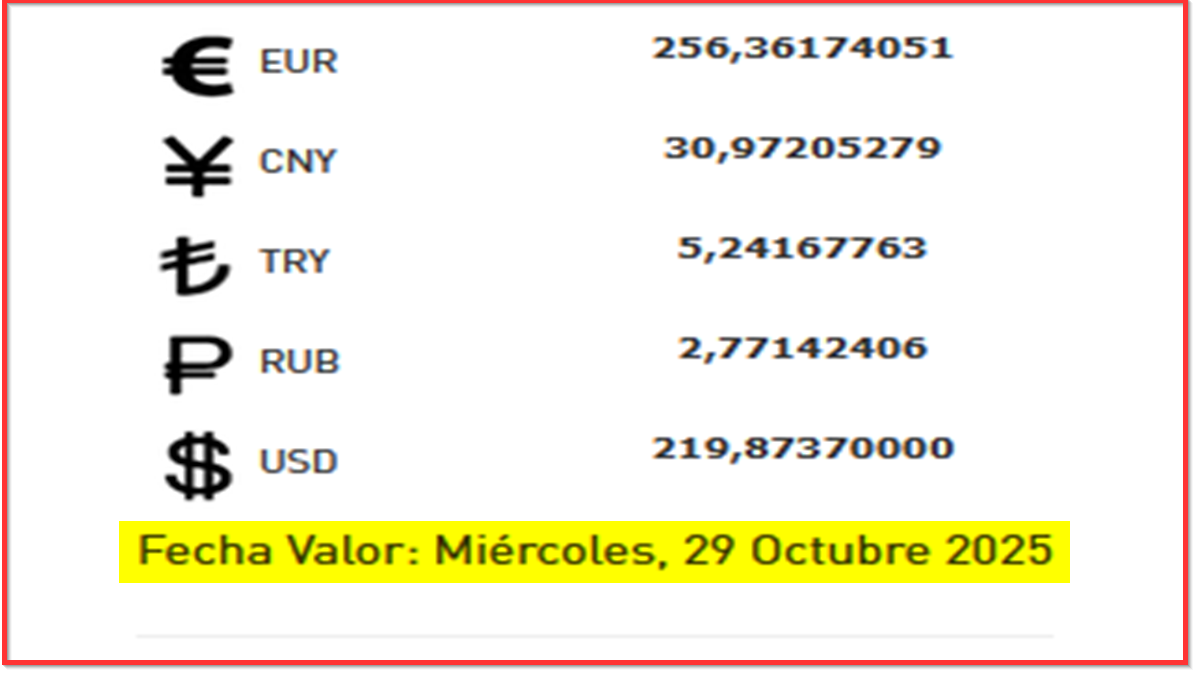BCV. Cambio oficial para transacciones del miércoles 29 de octubre de 2025 28 de octubre de 2025 - 5:40 pm Economia, Noticias 4,570 Vistas 2025-10-28 Javier Caceres Compartir Facebook Twitter LinkedIn Pinterest