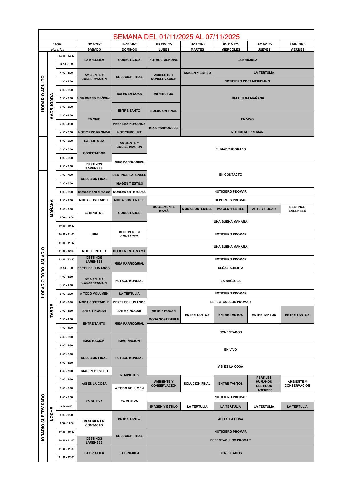 Programación entre el día sábado 1ro. al viernes 7 de noviembre de 2025 31 de octubre de 2025 - 11:17 pm Programación 5,308 Vistas 2025-10-31 Javier Caceres Compartir Facebook Twitter LinkedIn Pinterest