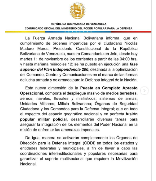 Efectivos de la Fuerza Armada Nacional Bolivariana (FANB) iniciaron a partir de este martes la fase superior del «Plan Independencia 200», así lo informó mediante un comunicado el ministerio de Defensa.