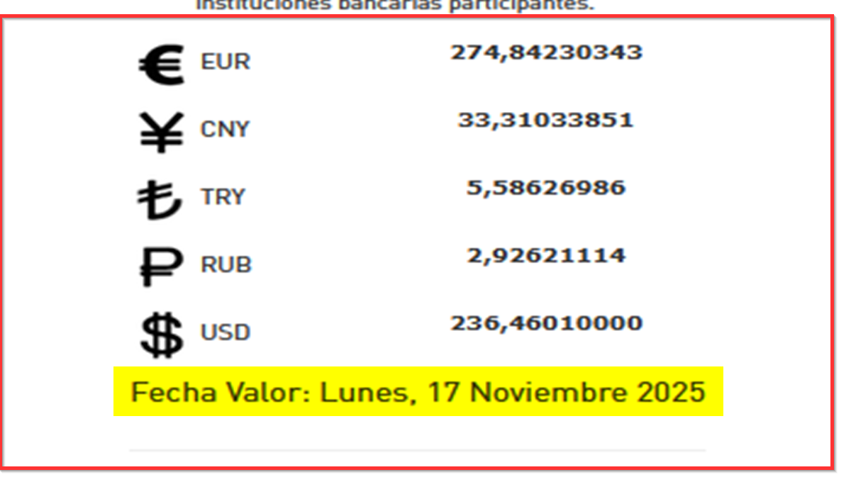 BCV. Cambio oficial referencial para transacciones desde el sábado 15 hasta el lunes 17 de noviembre de 2025 14 de noviembre de 2025 - 4:04 pm Economia, Noticias 5,730 Vistas 2025-11-14 Javier Caceres Compartir Facebook Twitter LinkedIn Pinterest
