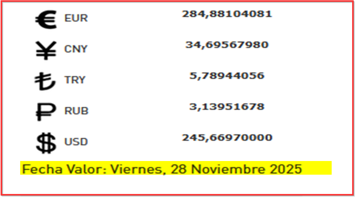 BCV. Cambio oficial referencial para transacciones del viernes 28 de noviembre de 2025 27 de noviembre de 2025 - 5:31 pm Economia, Noticias 5,217 Vistas 2025-11-27 Javier Caceres Compartir Facebook Twitter LinkedIn Pinterest