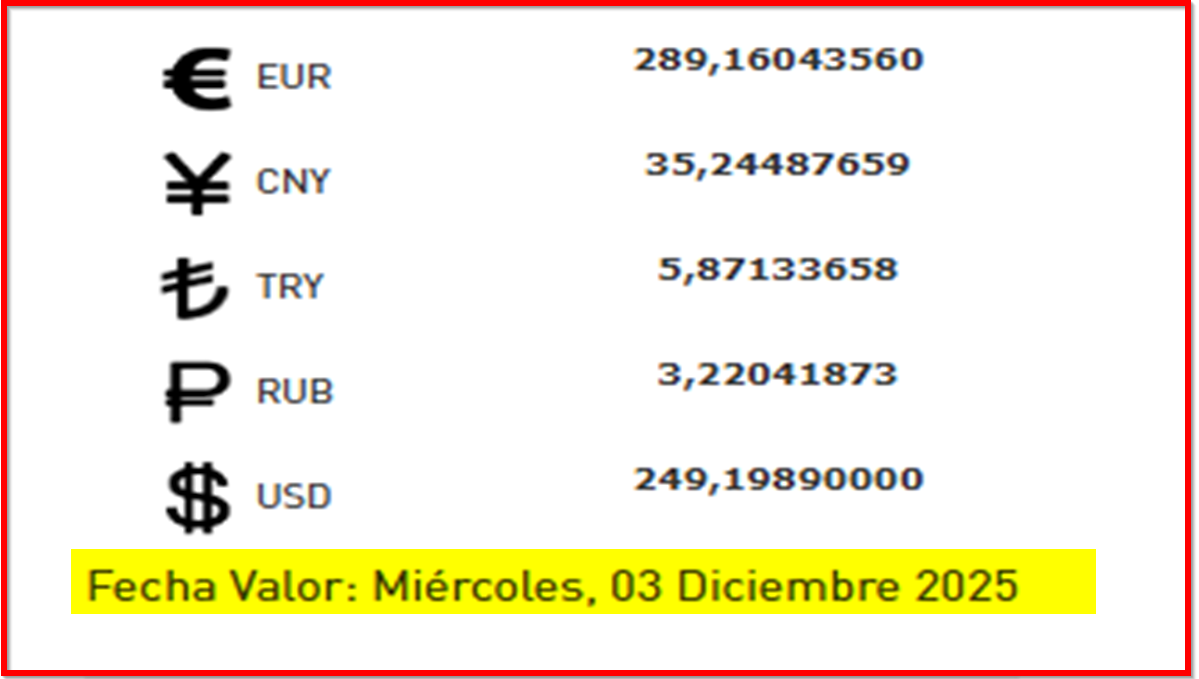 BCV. Cambio oficial referencial para transacciones del miércoles 3 de diciembre de 2025 02 de diciembre de 2025 - 8:05 pm Economia, Noticias 6,372 Vistas 2025-12-02 Javier Caceres Compartir Facebook Twitter LinkedIn Pinterest