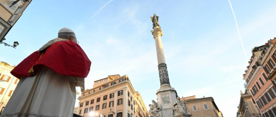 El pontífice elevó una oración especial y presentó una ofrenda de rosas blancas ante el monumento mariano.