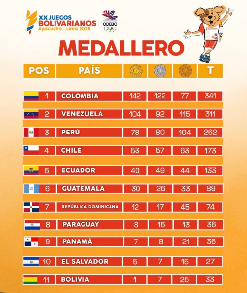La delegación venezolana cerró con broche de oro su participación en los Juegos Bolivarianos Ayacucho-Lima 2025, consolidándose como la segunda potencia del certamen solo por detrás de Colombia. El equipo Vinotinto sumó una cosecha histórica de 311 medallas: 104 de oro, 92 de plata y 115 de bronce, lo que representa un salto espectacular respecto a Valledupar 2022 (208 medallas totales y 61 oros).