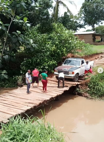 En el sector campesino Las Dos Ceibas, en el estado Bolívar, los agricultores denuncian que trasladan su mercancía a través de un débil puente de madera debido al colapso de la carretera.