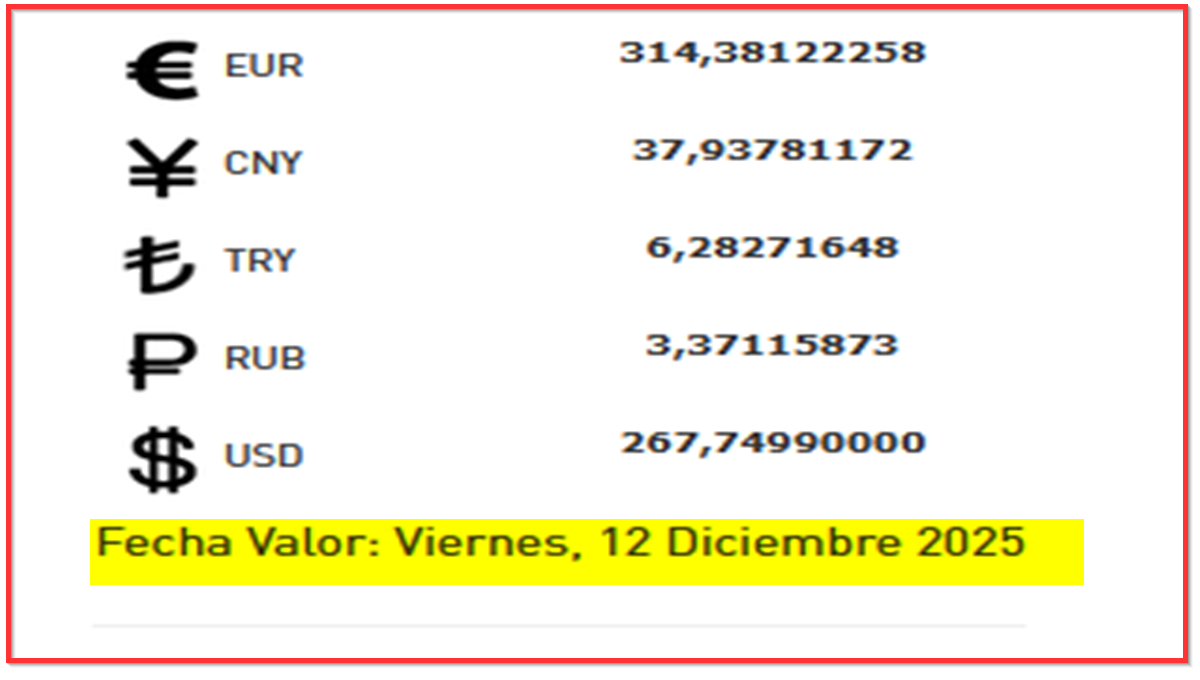 BCV. Cambio oficial referencial para transacciones del viernes 12 de diciembre de 2025 11 de diciembre de 2025 - 6:09 pm Economia, Noticias 5,569 Vistas 2025-12-11 Javier Caceres Compartir Facebook Twitter LinkedIn Pinterest