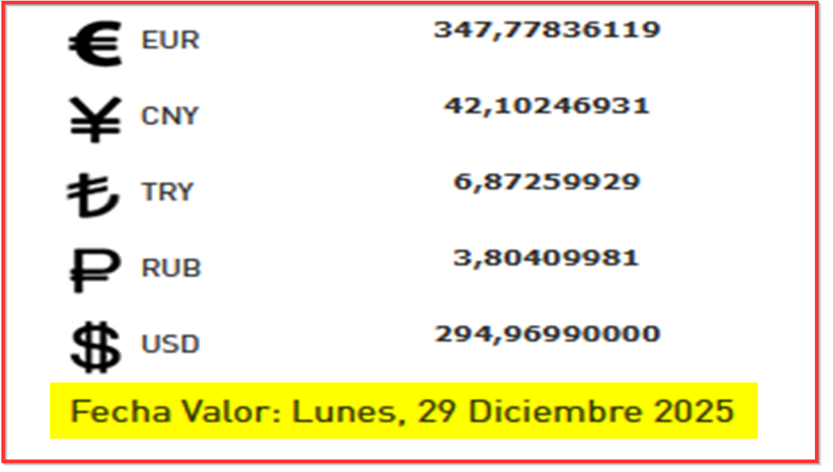 BCV. Cambio oficial para transacciones desde el sábado 27 al lunes 29 de diciembre 2025 26 de diciembre de 2025 - 6:11 pm Economia, Noticias 7,011 Vistas 2025-12-26 Javier Caceres Compartir Facebook Twitter LinkedIn Pinterest