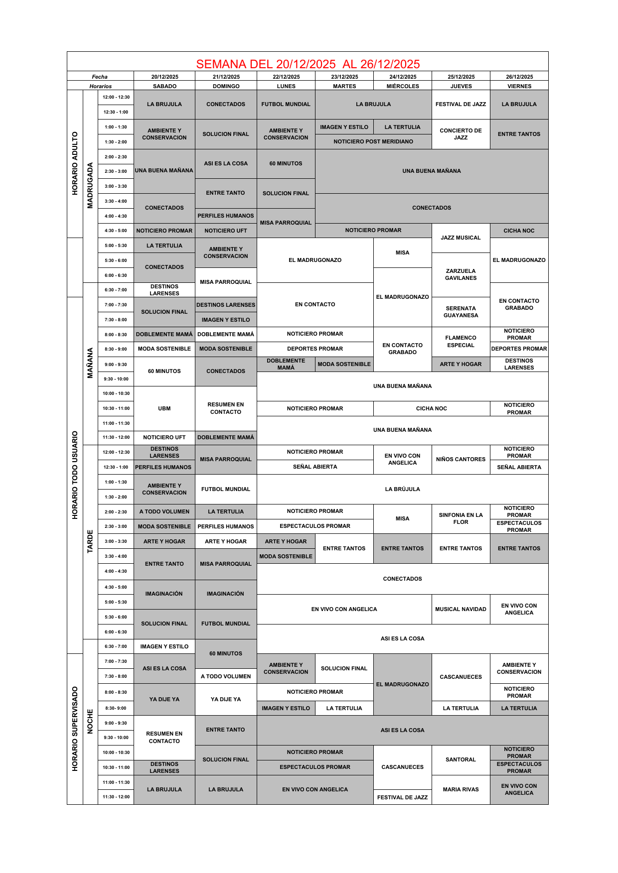 Programación entre el día sábado 27 de diciembre al viernes 2 de ENERO de 2026 Javier Caceres hace 4 horas