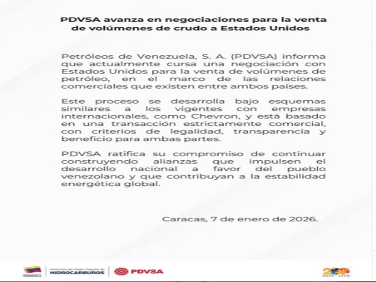Petróleos de Venezuela, S. A. (PDVSA) informa que cursa negociación con Estados Unidos para venderles petróleo en el marco de las relaciones comerciales que existen entre ambos países