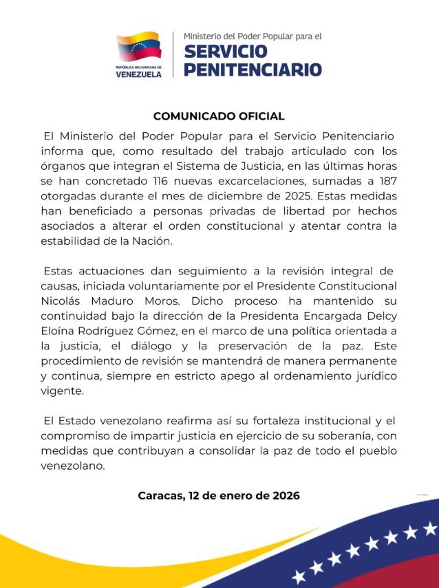 Como resultado del trabajo articulado de los órganos que integran el Sistema de Justicia, el Ministerio del Poder Popular para el Servicio Penitenciario informó mediante un comunicado oficial que en las últimas horas se concretaron 116 nuevas excarcelaciones, como parte del esfuerzo del Gobierno Bolivariano para garantizar la paz en el país.