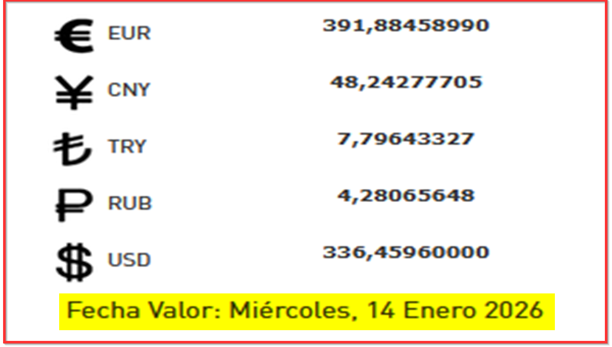 BCV. Cambio oficial referencial para transacciones del miércoles 14 de enero de 2026 13 de enero de 2026 - 5:45 pm Economia, Noticias 6,661 Vistas 2026-01-13 Javier Caceres Compartir Facebook Twitter LinkedIn Pinterest