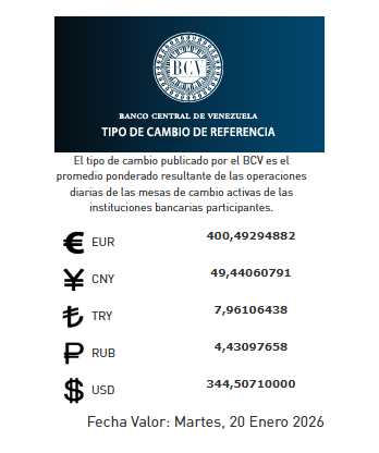 BCV. Cambio oficial referencial para transacciones del martes 20 de enero del 2026 20 de enero de 2026 - 7:19 am Noticias 76 Vistas 2026-01-20 Equipo de Prensa Compartir Facebook Twitter LinkedIn Pinterest