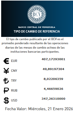 BCV. Cambio oficial referencial para transacciones del miércoles 21 de enero del 2026 21 de enero de 2026 - 7:57 am Noticias 96 Vistas 2026-01-21 Equipo de Prensa Compartir Facebook Twitter LinkedIn Pinterest