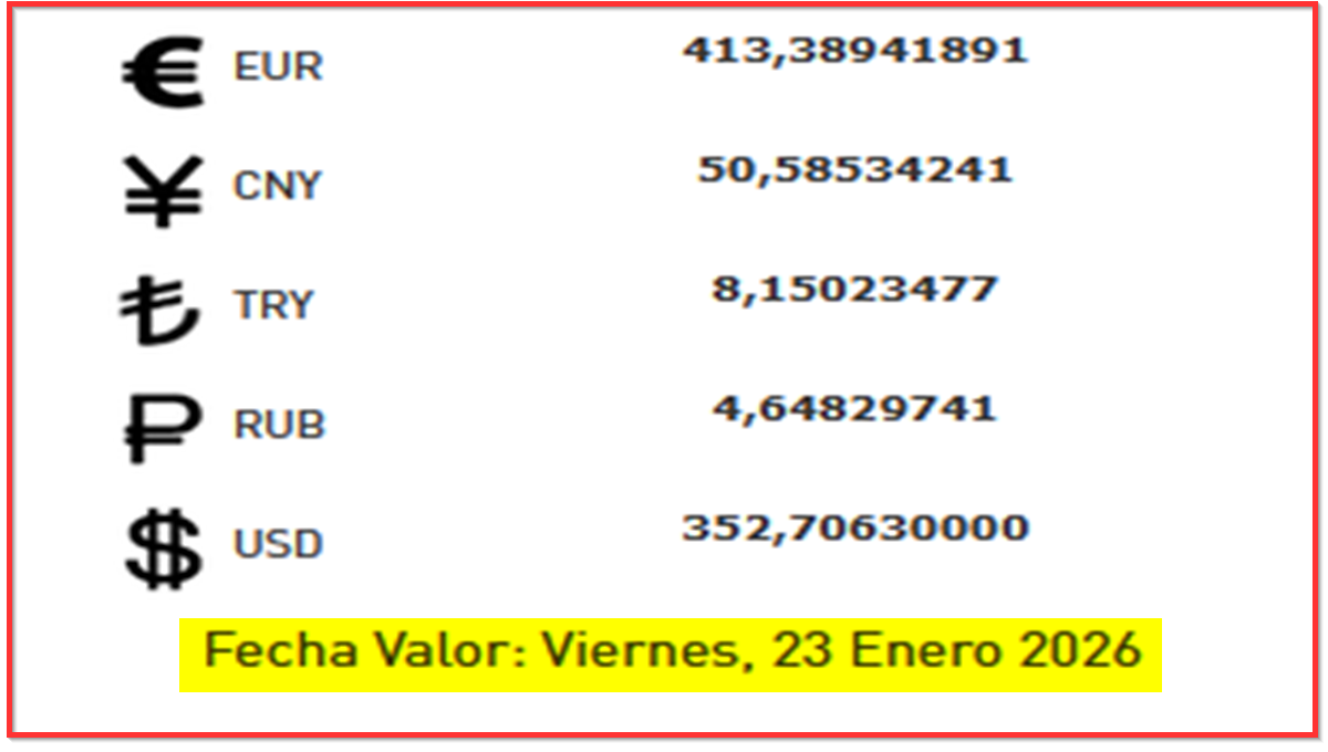 BCV. Cambio oficial referencial para transacciones del viernes 23 de enero de 2026 22 de enero de 2026 - 4:35 pm Economia, Noticias 6,720 Vistas 2026-01-22 Javier Caceres Compartir Facebook Twitter LinkedIn Pinterest